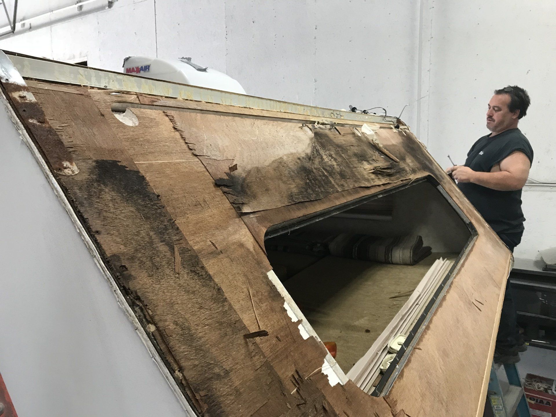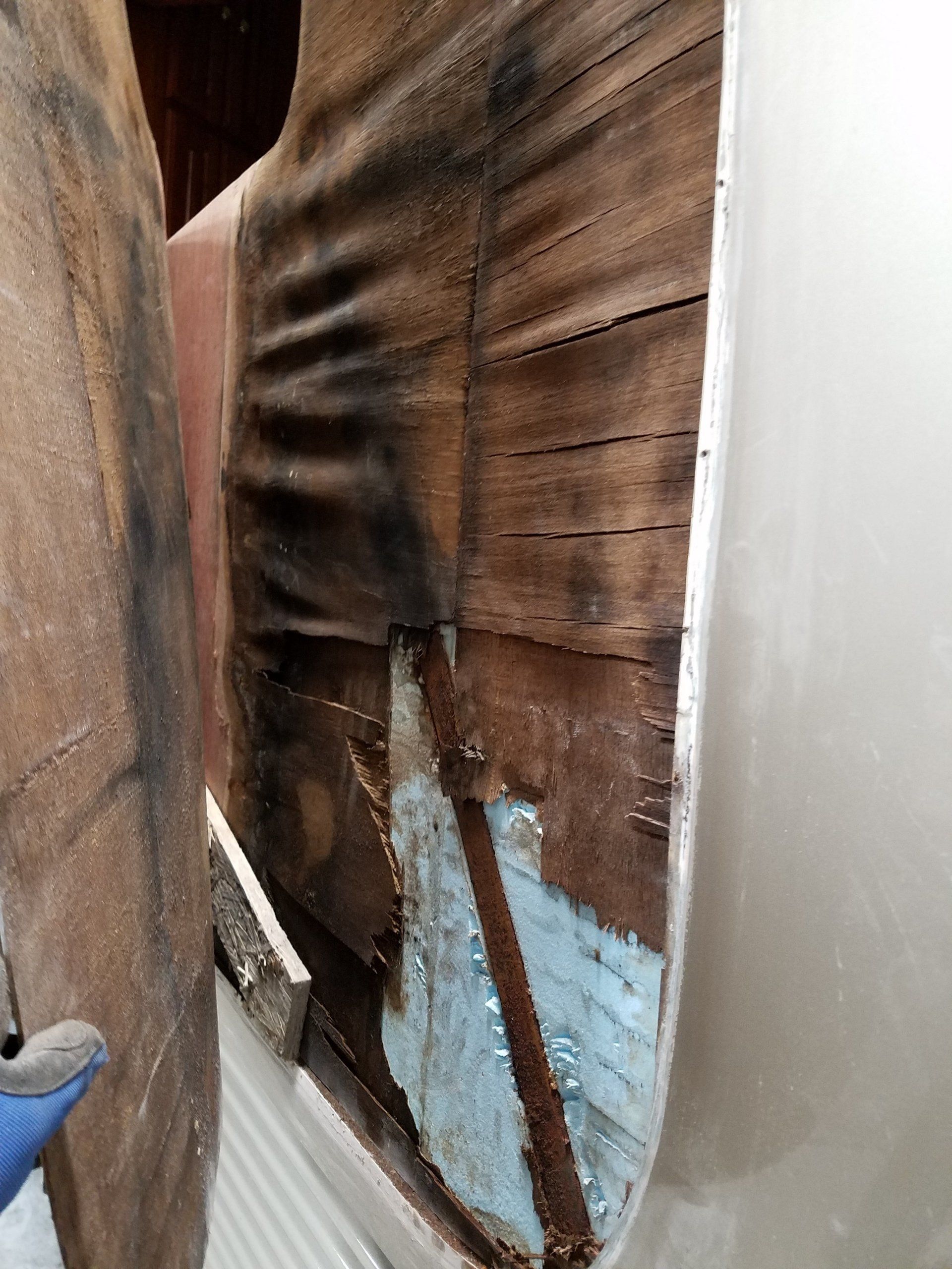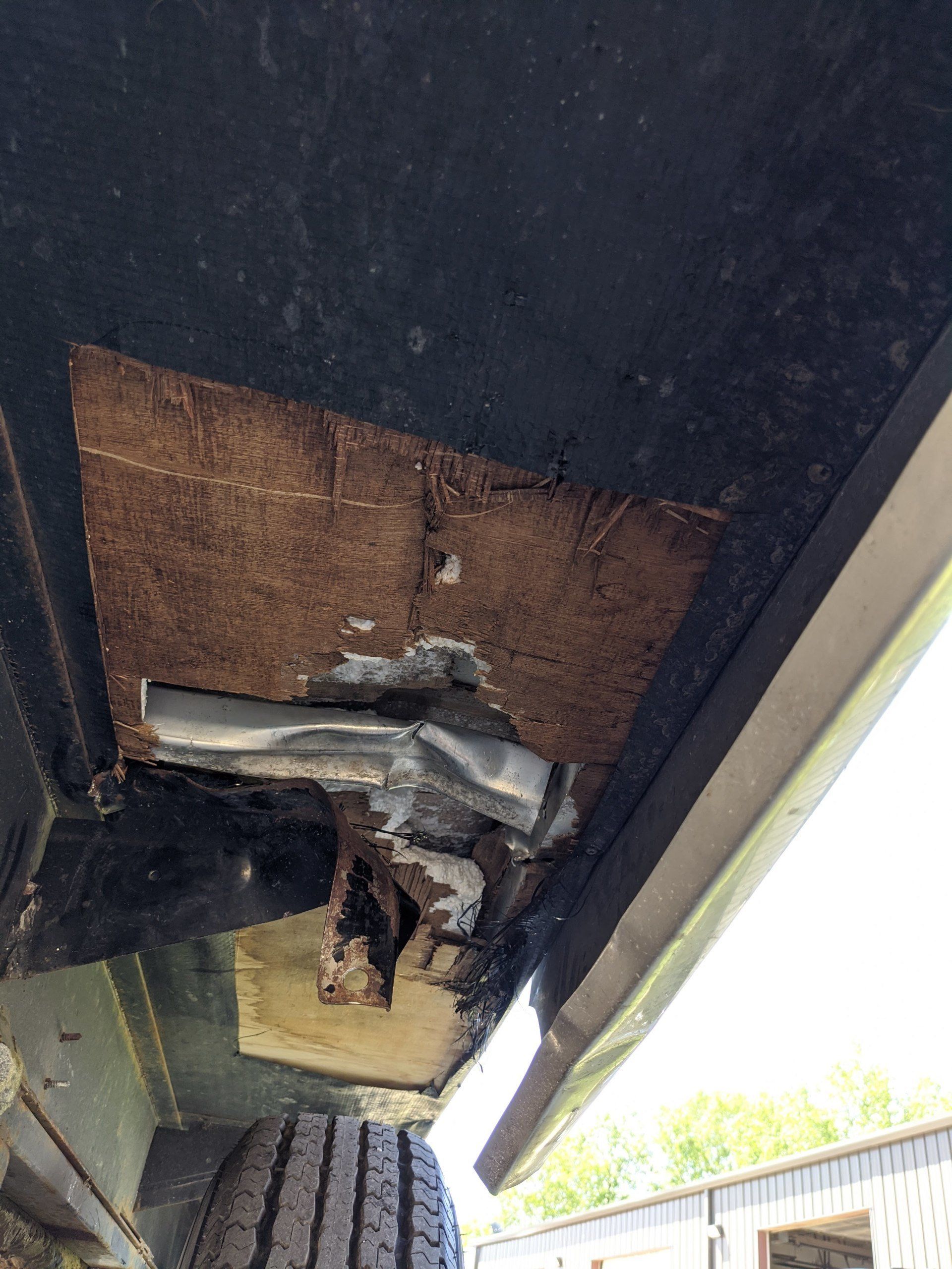 This trailer was a 2 part job. The damage started with a storm causing a tree branch to fall on it and crack the front cap. Even though temporary repairs were made, they did not hold up and ultimatly let water in. The results were pretty substantial. While we were repairing the damage, we learned the the framing was less than adequate so we repaired that as well.