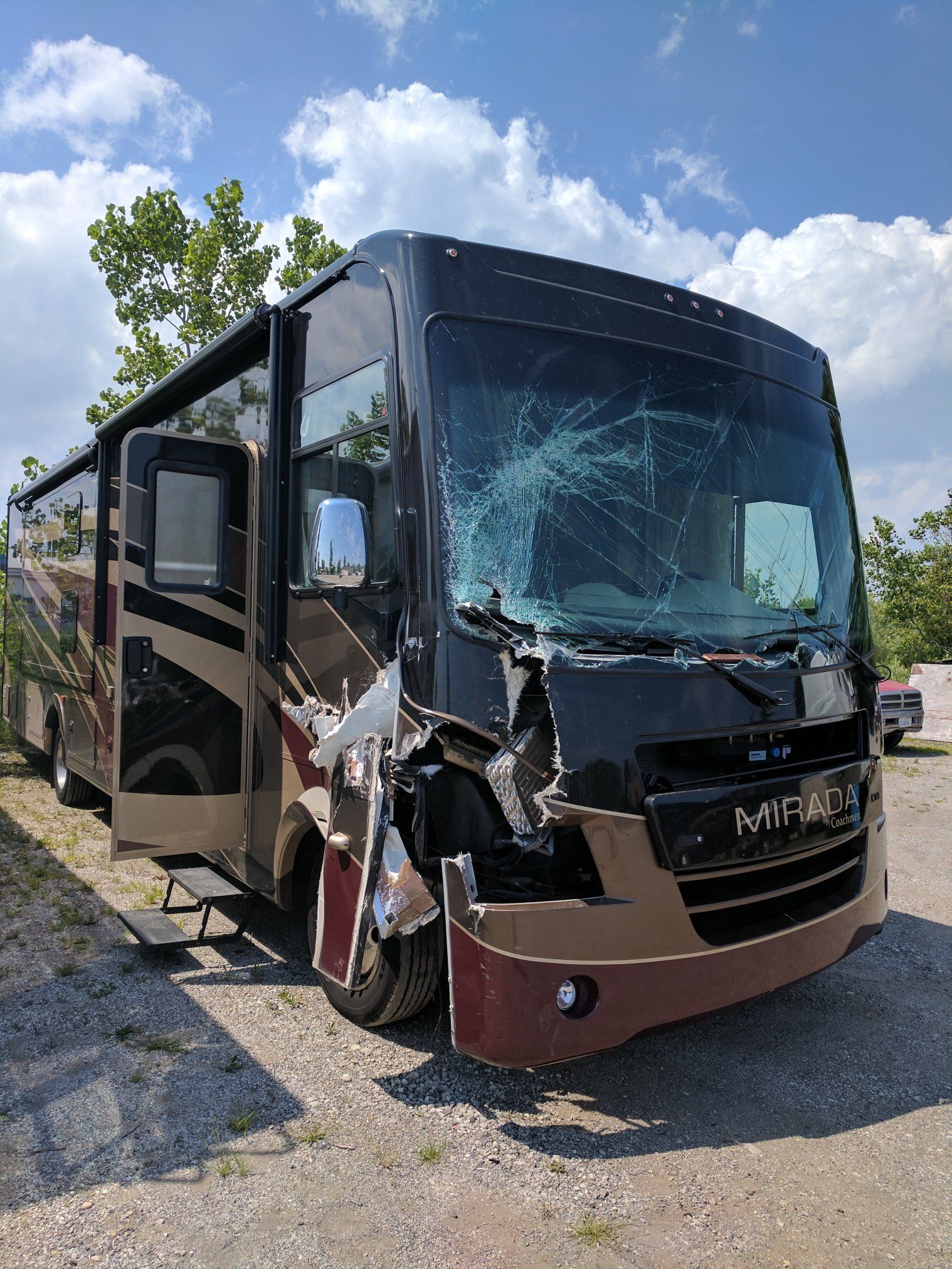 With only 4000 miles on this coach, it was driven into a box truck was being loaded with the lift gate opened up. Even at low speed, a significant amount of damage was done.