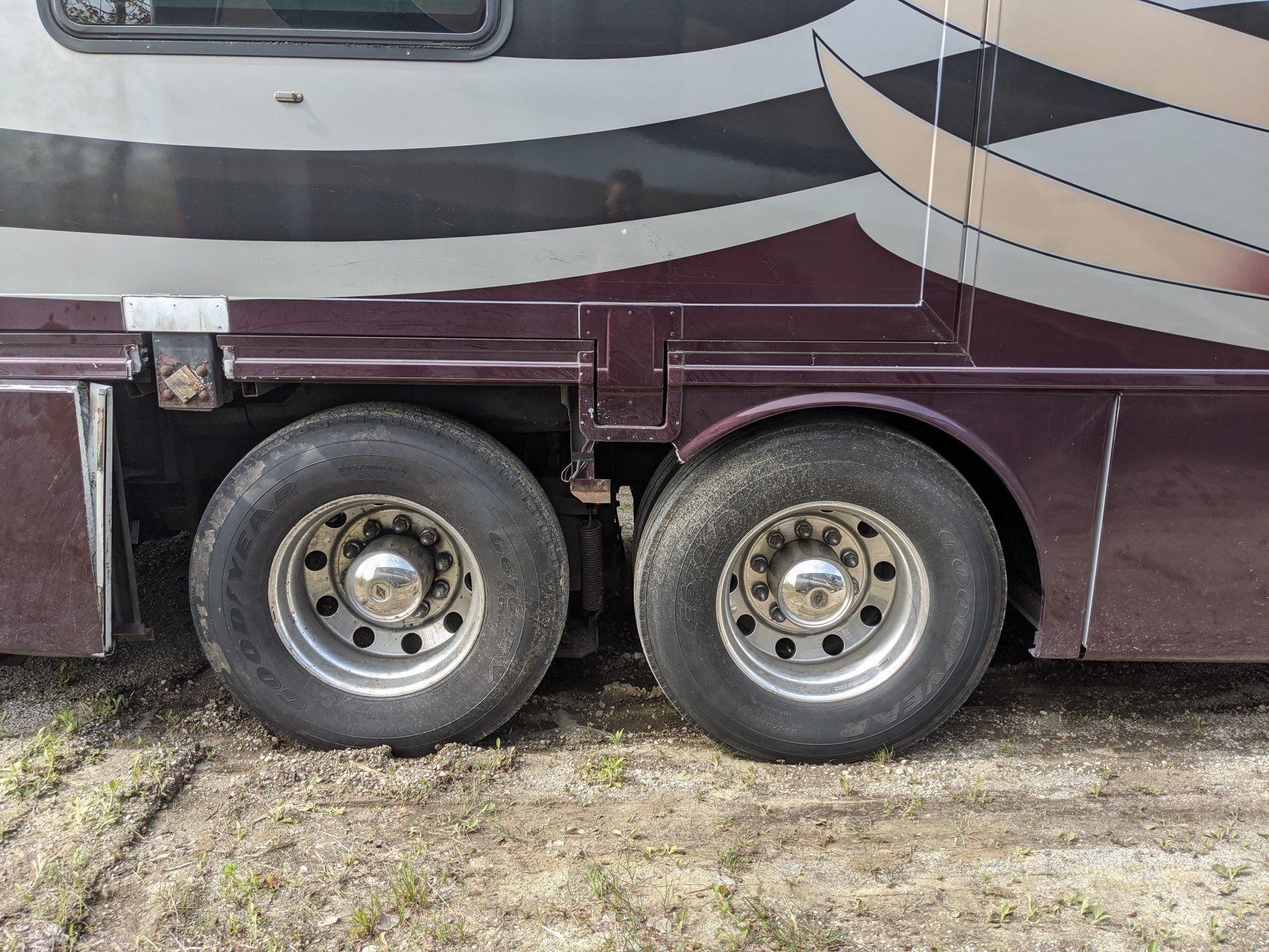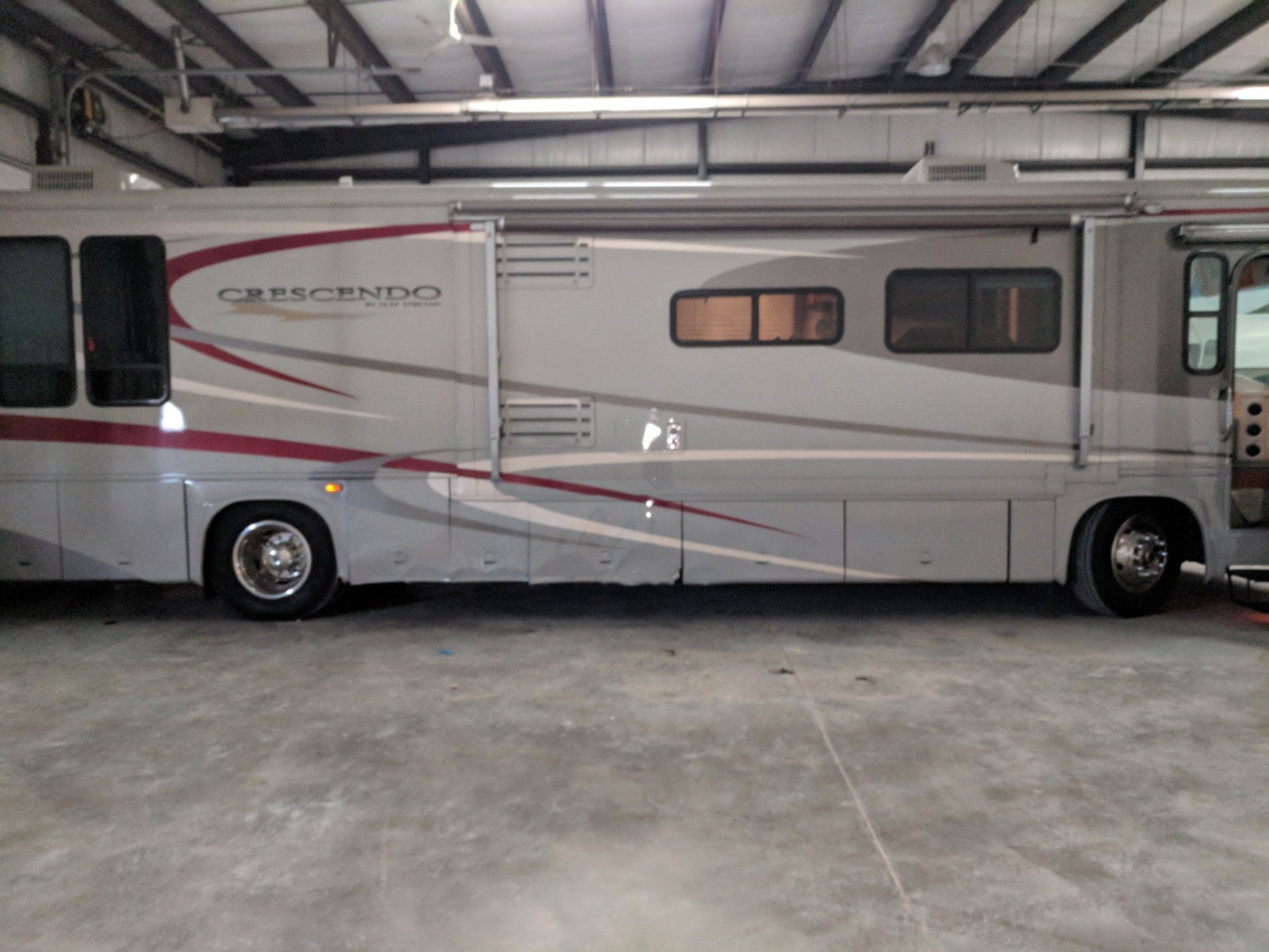 This coach has been here on a few occasions. The typical lower door repair/replacement accident was the first time. The second time was for Aqua Hot repairs, and the last time was a turn cut a little too short.