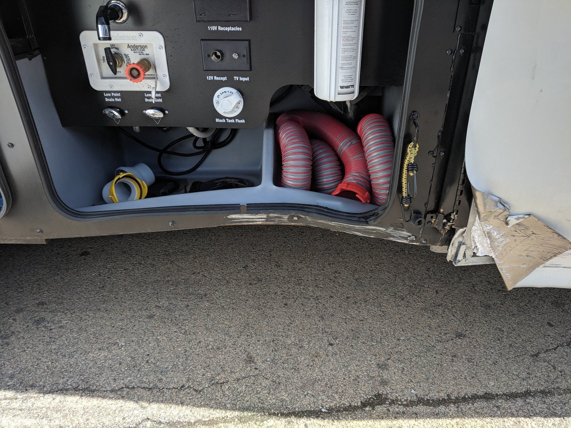 This poor guy couldn't avoid debris off another truck. It took out his front bra, his leveling jack, and eventually his tag tire, which then took out the wheel skirt, compartment door, battery tray, house batteries, and even the washer/dryer.