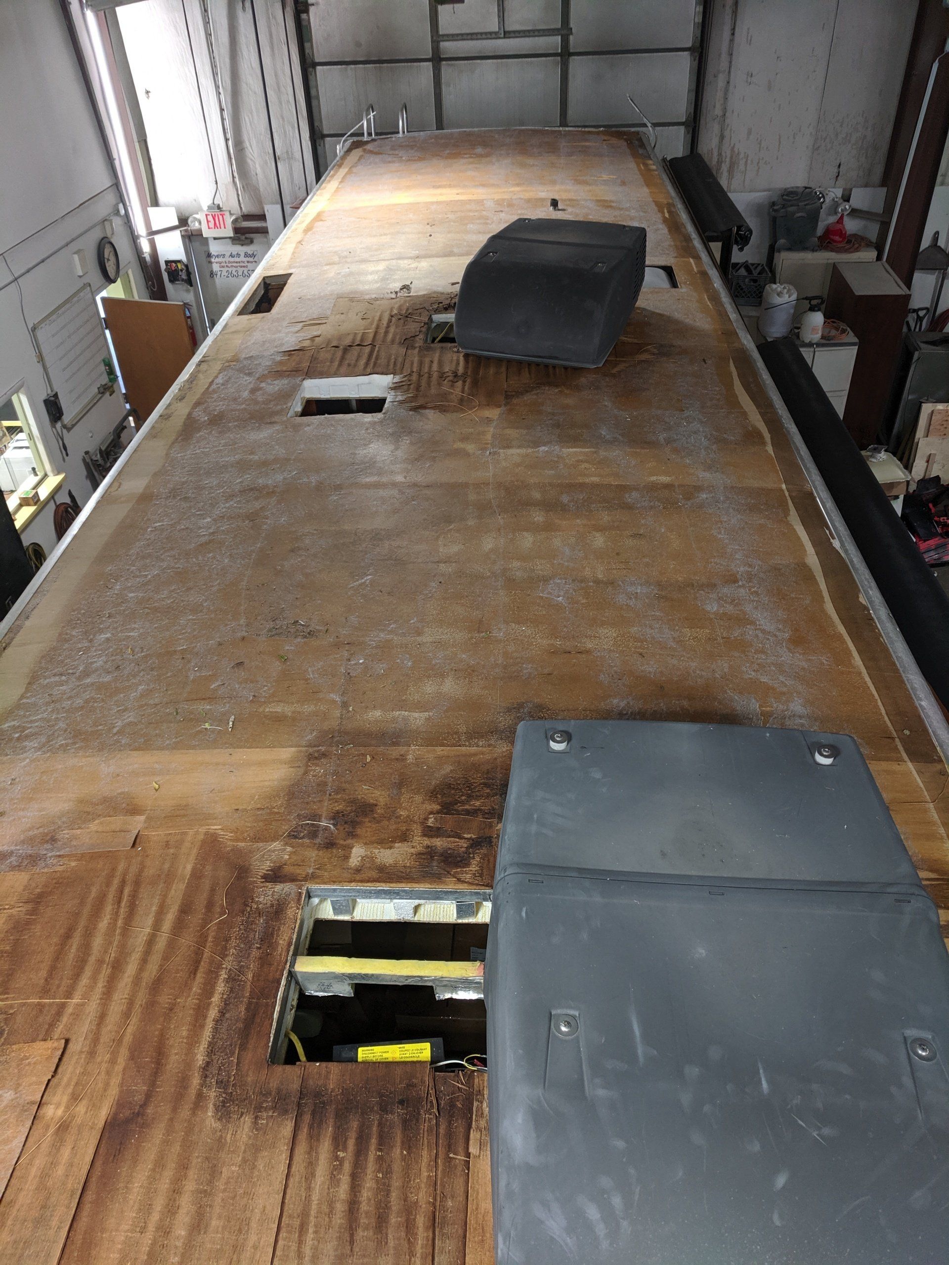 This is a pretty rough case of roof rot. The leak was neglected for quite some time. Given the age and value of this specific trailer, our customer opted to replace the lumber and membrane where it was damaged and coat the rest of the roof with a liquid rubber. He wanted to finish the interior himself.